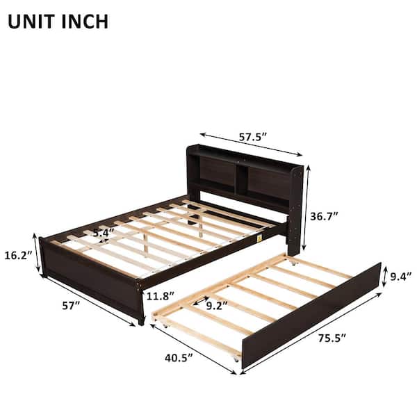 Espresso Brown Wood Frame Full Size Platform Bed with Trundle and Bookcase
