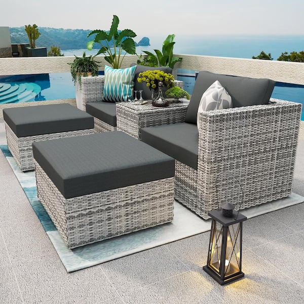 Gray 5-Pieces Wicker Outdoor Sectional Set with Dark Gray Cushions, 2 Pillows and Protection Cover
