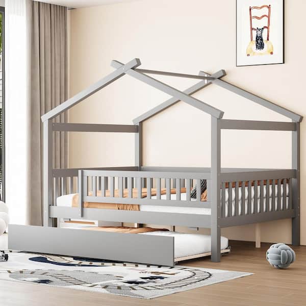 Gray Full Size Wood House-Shaped Bed with Full-Length Guardrail and Trundle