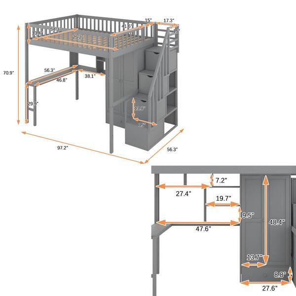 Gray Full Size Wooden Loft Bed with Wardrobe, Drawer, Desk, Bookshelf and Storage Staircase