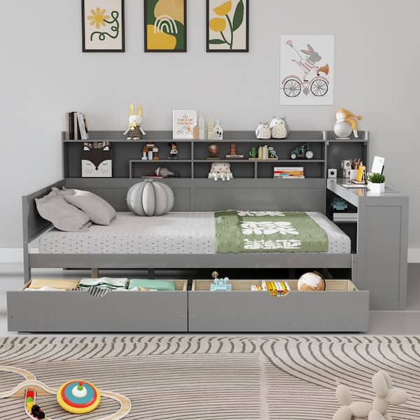 Gray Multi-functional Full Size Wood Daybed with Storage Shelves, 2-Drawers and Study Desk