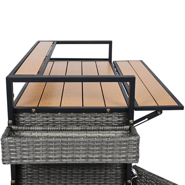Gray Outdoor Wicker Grill Cart with Extended Tabletop, Rolling Kitchen Island on Wheels with Storage Cabinet