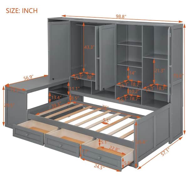 Gray Stylish Modern Wood Twin Daybed with Built-In Cabinet, 3 Drawers, Desk-Versatile Design with 2 Assembly Options