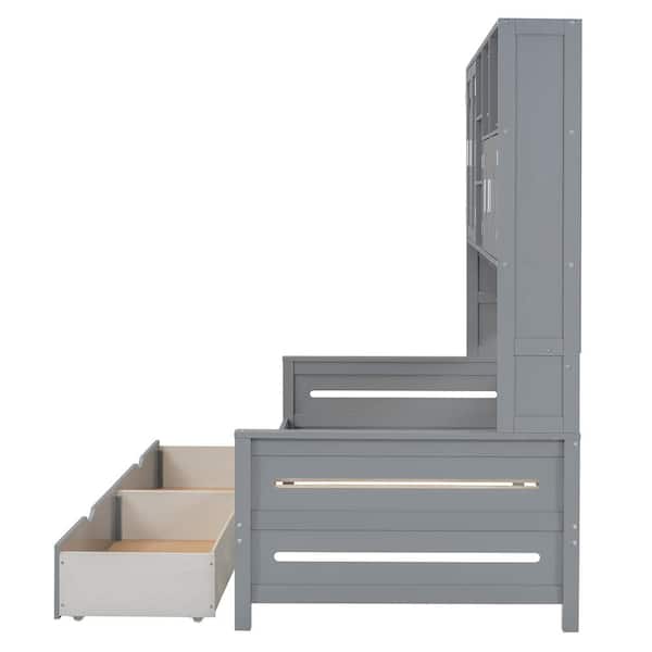 Gray Twin Size Wood Daybed with 2 Drawers, All-in-One Cabinet, Storage Shelves