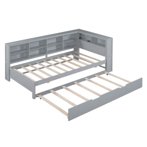 Gray Twin Size Wood Daybed with Twin Size Trundle, Storage Shelf and USB Charging Ports