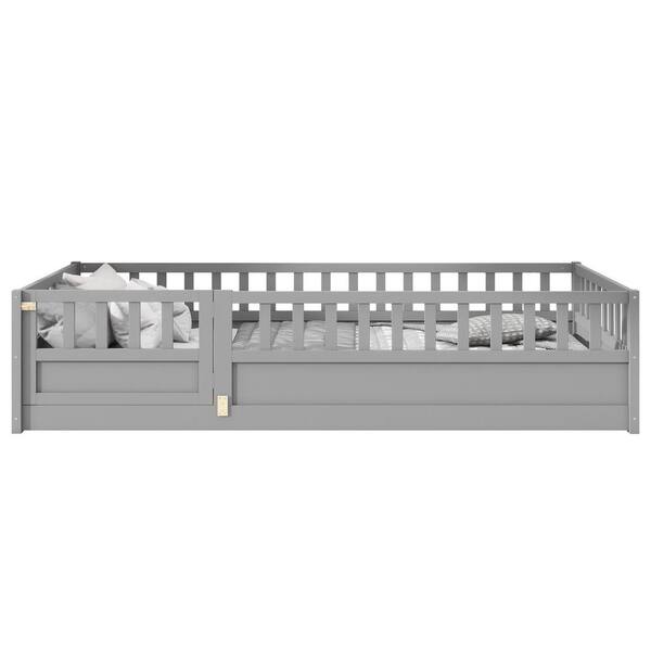 Gray Twin Size Wood Frame Floor Bed, Platform Bed with High Security Fence and Door, Support Slats