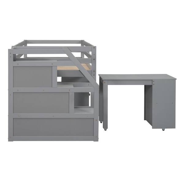 Gray Twin Size Wood Low Loft Bed with Movable Desk, 2 Open Compartments, 2 Shelves, 3-Drawer, Storage Stairs