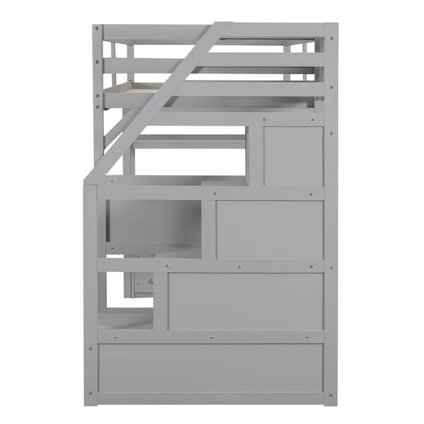 Gray Twin Size Wooden Loft Bed with Storage Staircase, Built-in Desk, Shelves and 2 Drawers