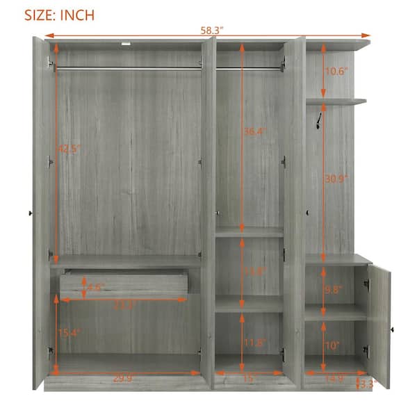 Gray Wood 59.8 in. 4-Door Wardrobe Armoire with Drawer, Full-Length Mirror and 2-Hanging Rails
