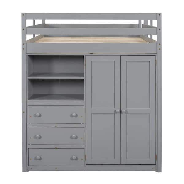 Gray Wood Frame Full Size Loft Bed with Wardrobe, Built-in Desk, Storage Shelves, 3-Drawer