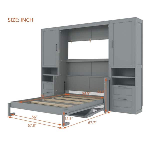 Gray Wood Frame Full Size Murphy Bed Wall Bed with Drawers, Built-in Table, Shelves