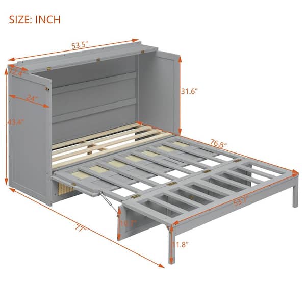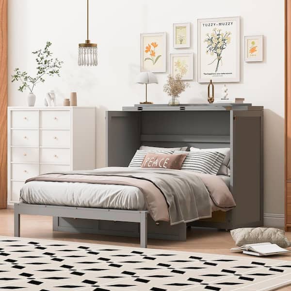 Gray Wood Frame Full Size Murphy Bed with Large Drawer, Rattan Decoration