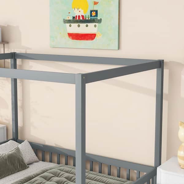 Gray Wood Frame Full Size Platform Bed with Canopy Frame, Fence Guardrails