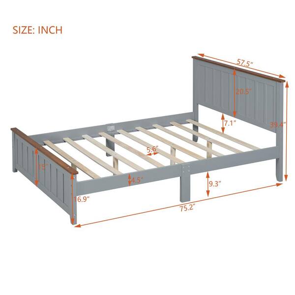 Gray Wood Frame Full Size Vintage Platform Bed with Rectangular Headboard and Footboard