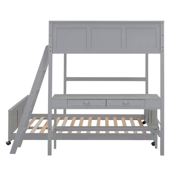 Gray Wood Frame Full over Full Bunk Bed with Built-in Desk and 2-Drawer, Movable Lower Bed, Sloping Ladder