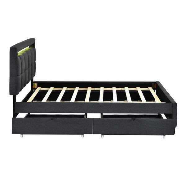 Gray Wood Frame Queen Size Linen Upholstered Platform Bed with LED Lighted Headboard, Twin XL Trundle, 2-Drawers