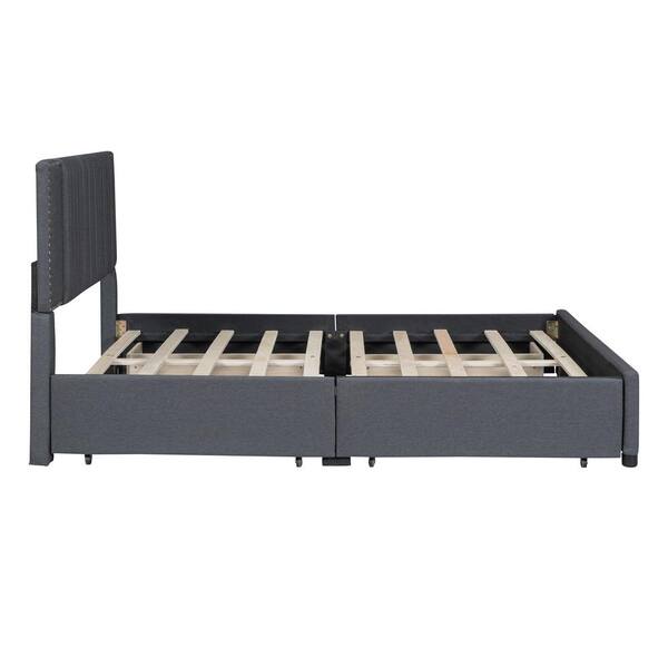 Gray Wood Frame Queen Size Linen Upholstered Platform Bed with Nailhead Trim Headboard and 4-Drawer