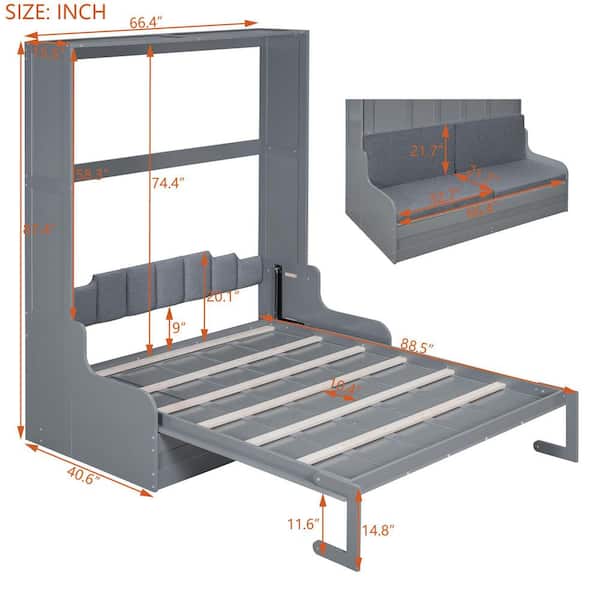 Gray Wood Frame Queen Size Murphy Bed, Wall Bed with Cushion, Folded into a Cabinet with 2-Seat Chair, Headboard