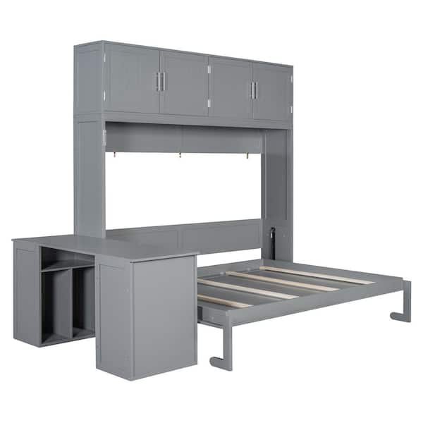 Gray Wood Frame Queen Size Murphy Bed Wall Bed with Desk, Cabinets, Shelves