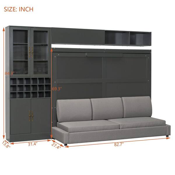 Gray Wood Frame Queen Size Murphy Bed Wall Bed with Light, Top Cabinets, Wine Racks, Shelves, USB Charging