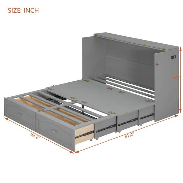 Gray Wood Frame Queen Size Murphy Bed with Built-in Charging Station, Pulleys and Sliding Rails Design, 2-Drawer