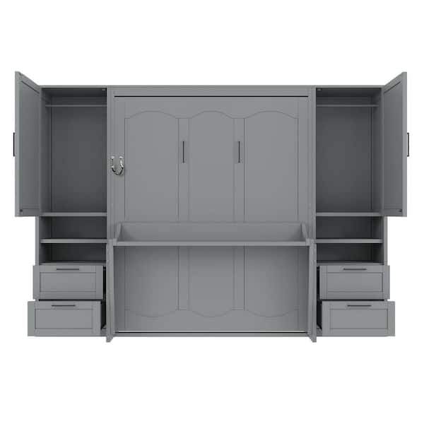Gray Wood Frame Queen Size Murphy Bed with Closet, Drawers and Shelves