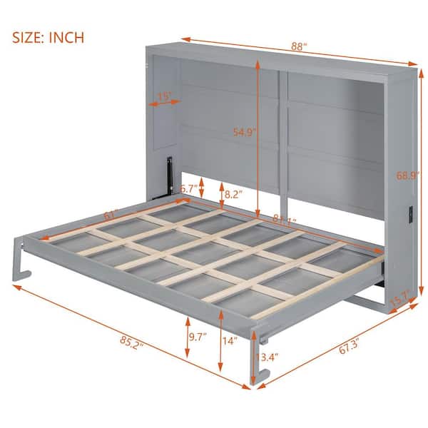 Gray Wood Frame Queen Size Murphy Bed with USB Charging Station