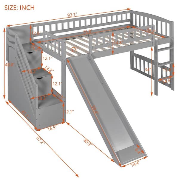 Gray Wood Frame Twin Size Loft Bed with Slide, Staircase with 2-drawers