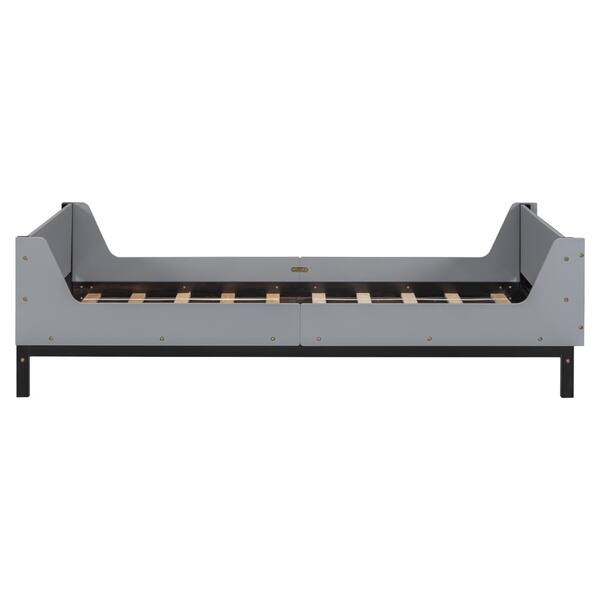 Gray Wood Frame Twin Size Platform bed with Bed-end Storage Book Rack, Side Guardrails