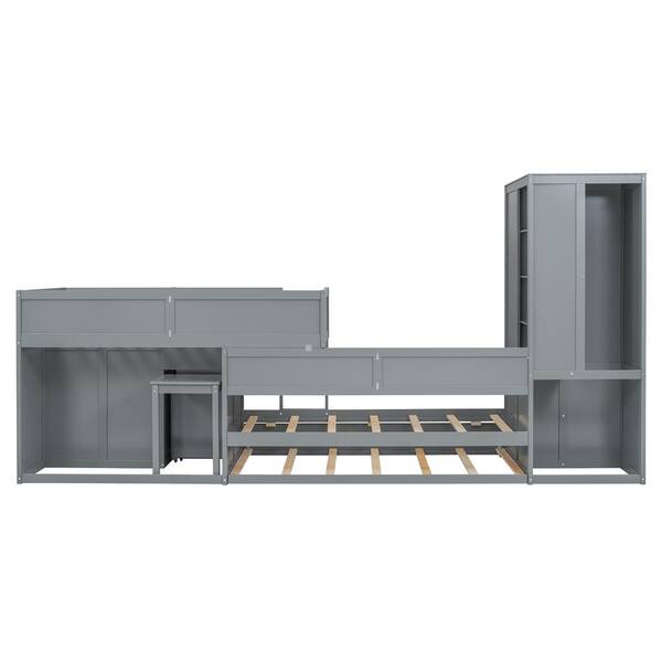 Gray Wood Frame Twin over Twin Bunk Bed with Twin Trundle, Built-in Wardrobe, Desk, Drawers, Cabinet