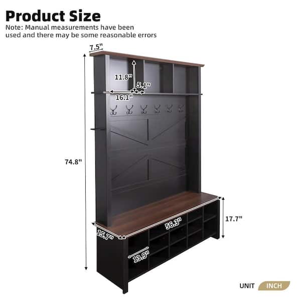 Hallway Black Hall Tree with 6 Hooks, Ample Open Compartments, Coat Racks, Shoe Cubbies Storage