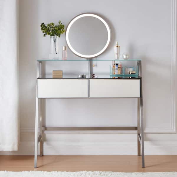 Modern 33.9 in. Silver Makeup Vanity Table with Mirror and Lights, 2 Drawers, Shelves, Built-in Charging Station