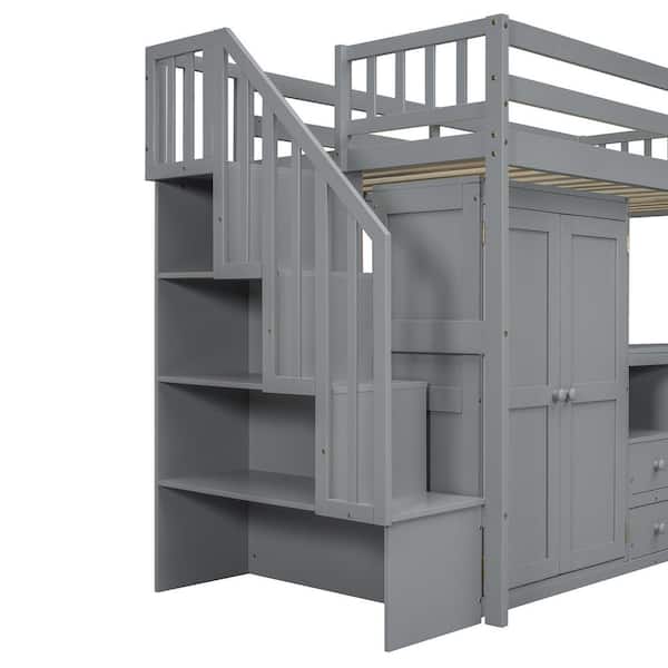 Multifunctional Gray Twin Size Wood Loft Bed with Stairs, Bookshelf, Drawers, Desk, Wardrobe