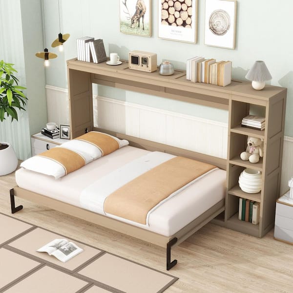 Natural(Brown) Wood Frame Full Size Murphy Bed with Shelves, Folded as a Cabinet