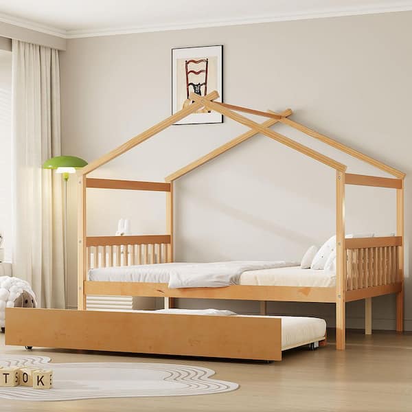 Natural Full Size Wood House Bed Kids Bed with Twin Size Trundle