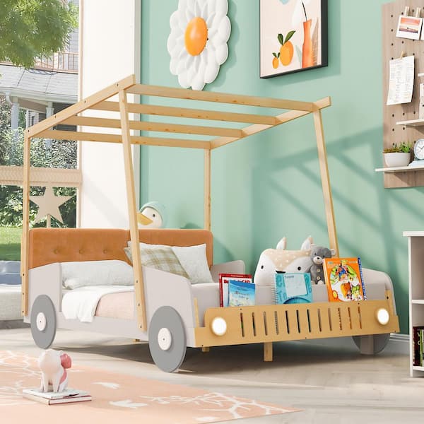 Natural Wood Frame Full Size Car-Shaped Platform Bed with Cushioned Headboard, Ceiling Cloth and LED
