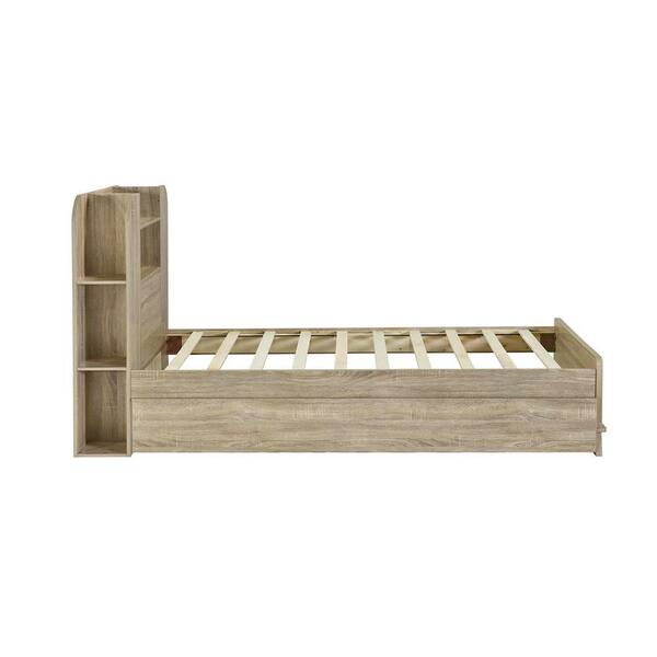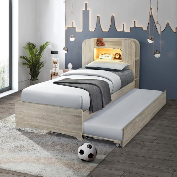 Natural Wood Frame Twin Size Platform Bed with Storage Headboard, Multiple Shelves, Twin Size Trundle, Light Strip