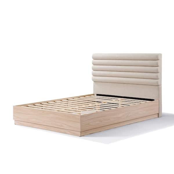 Natural (Yellow) Wood Frame Queen Size Platform Bed with Taupe Boucle Fabric Upholstered Headboard