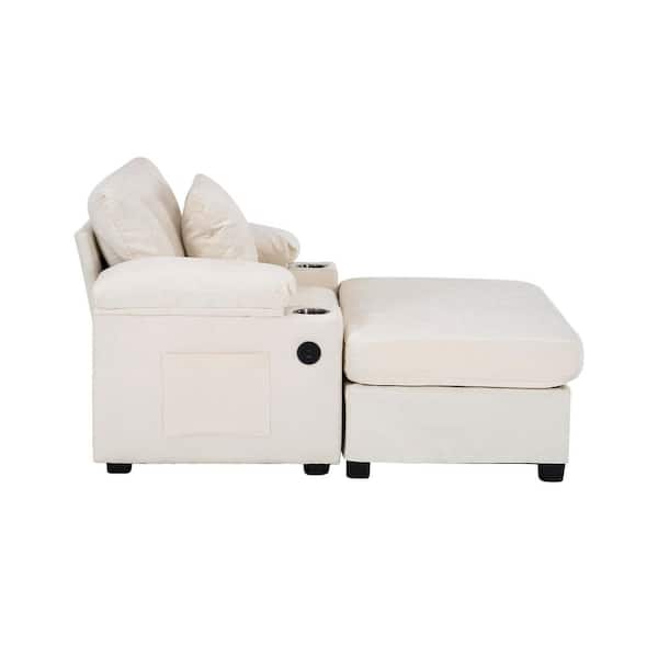 Oversized Beige 38.6 in. Chenille Chaise Lounge with Charge Station, Cup Holders, Side Pockets, Flip-Top Storage Boxes