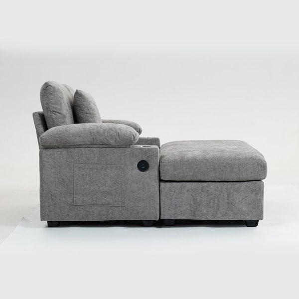 Oversized Gray 38.6 in. Chenille Chaise Lounge with Charge Station, Cup Holders, Side Pockets, Flip-Top Storage Boxes