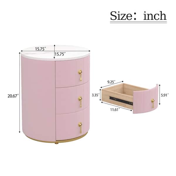 Pink 3-Drawer 15.75 in. W Round Upholstered Nightstand with Metal Handles, Marbling Stickers Top