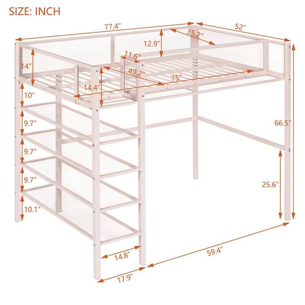 Pink Twin Size Metal Loft Bed with 4-Tier Shelves and Bedside Storage Shelve