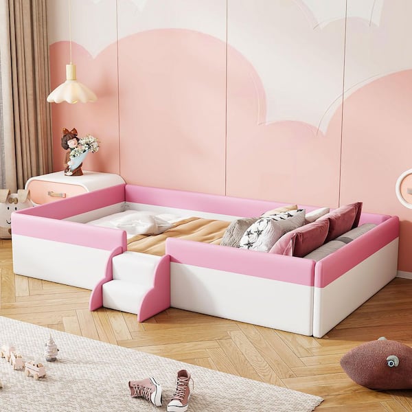 Pink and White Wood Frame Twin Size Upholstered Platform Bed with Fence and Stairs