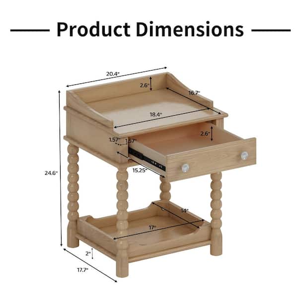 Retro Style 1-Drawer Natural Nightstand with Open Shelf, Turned Legs, Metal Handle