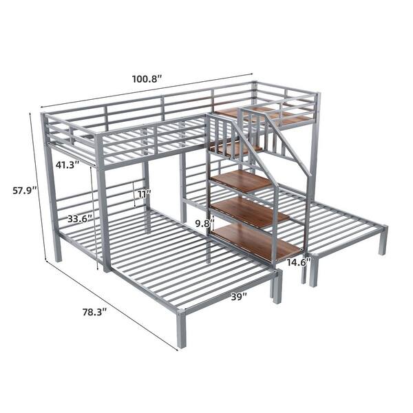 Silver Twin over Twin Metal Triple Bunk Bed with Storage Shelves Staircase