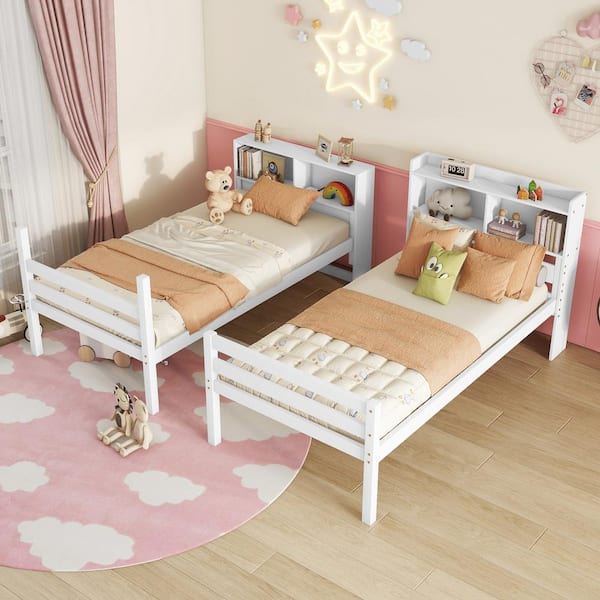 Solid Wood Frame White Twin Over Twin Bunk Bed with Bookcase Headboard