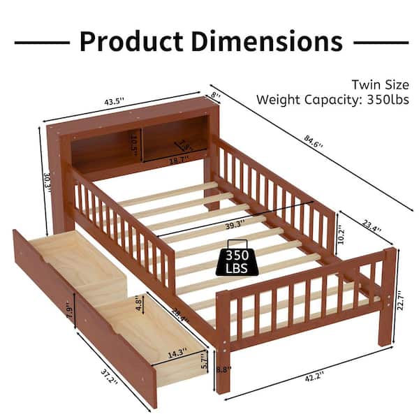 Walnut Twin Size Kids Platform Bed with Storage Headboard Rack, Safety Guardrails and 2-Drawers