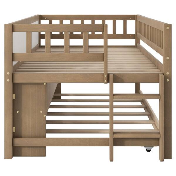 Walnut Twin Size Wood Platform Bed, Kid Bed with Storage Shelves, Blackboard, Twin Trundle