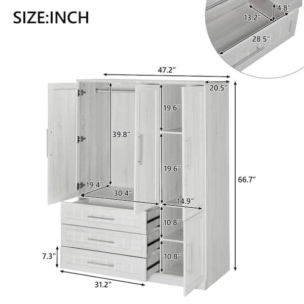 White 47.2 in. 4-Doors Wardrobe Armoire with Storage Shelves, 3 Drawers and Built-in Hanging Rail