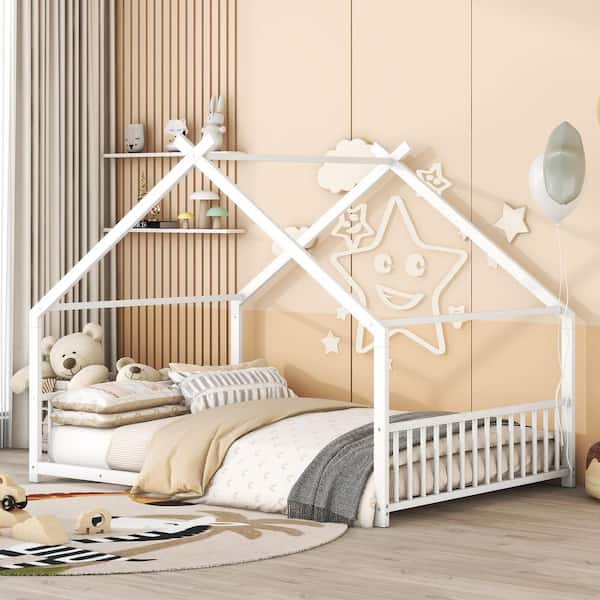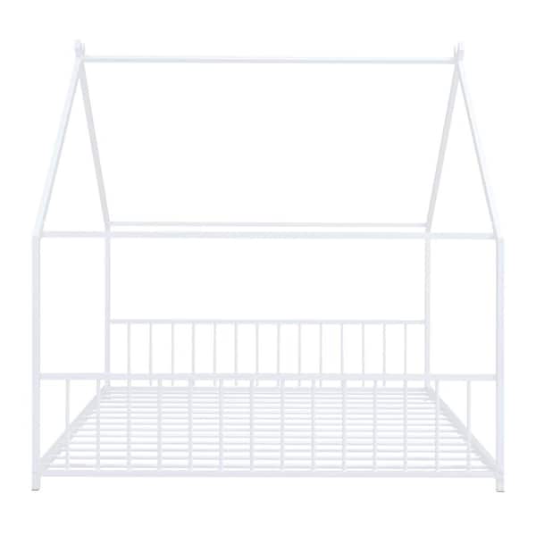 White Full Size Metal House Platform Bed, Low Bed for Kids